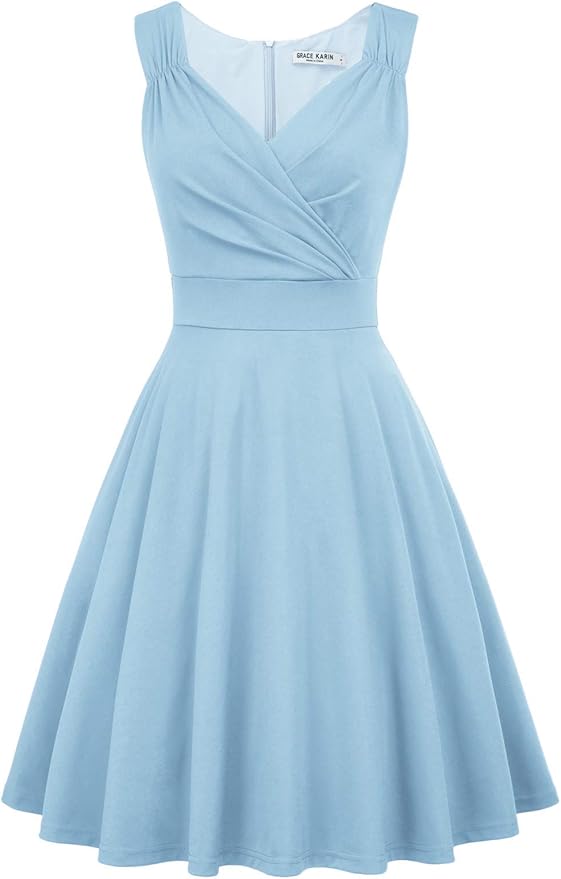Blue 50s Vintage Sleeveless V-Neck A-Line Swing Party Cocktail Dress