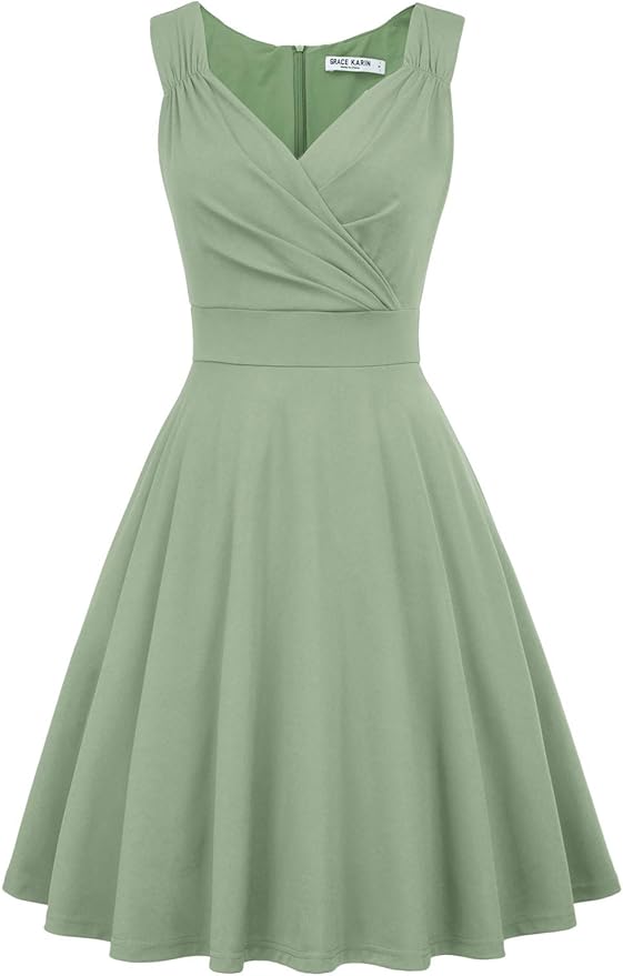Green 50s Vintage Sleeveless V-Neck A-Line Swing Party Cocktail Dress